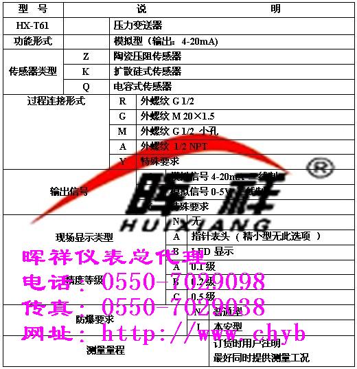 一、概述 HX-T61系列压力变送器是一种零点和满量程输出可以准确调校的压力变送器,其电路转换模块置于外观漂亮, 非常流行的 2088 型机壳。其传感器采用陶瓷压阻传感器或带不锈钢隔离模片的扩散硅传感器。HX-T61系列压力变送器可以直接安装在被测压力管道法兰的接口上,为安装调试方便,在法兰接口和管道之间应加装截止阀。安装位置对零点的影响可以调校,被测介质应与变送器结构材料相适应。
